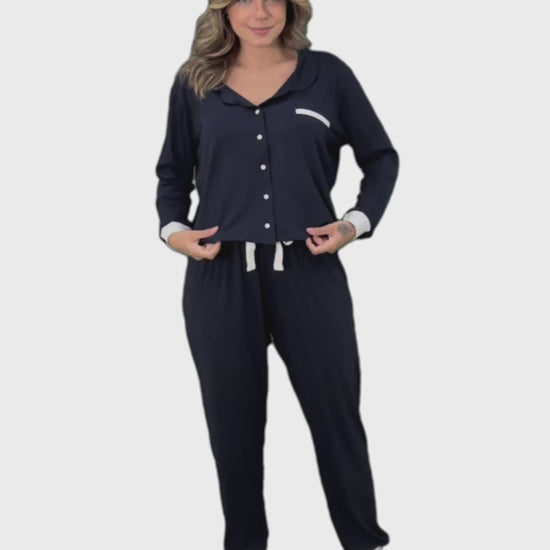 Our Women's Long American Pajama Navy Blue are made from 65% Polyester, 35% Cotton. Pink Dream monitors all raw materials. We choose the types of fibers we will use, then the types of yarns and weaving techniques. The dyeing and printing processes are carried out by Pink Dream partners, all of whom are certified to care for the environment. This way, Pink Dream delivers the best raw material with the lowest environmental impact.