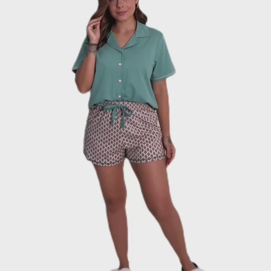 Stay cool and comfortable with our Women's Short Cotton Pajama Set in Green Arabesque, crafted from breathable cotton. The elegant arabesque print adds a touch of sophistication to your nighttime routine. Perfect for feeling refreshed and effortlessly stylish while you sleep!